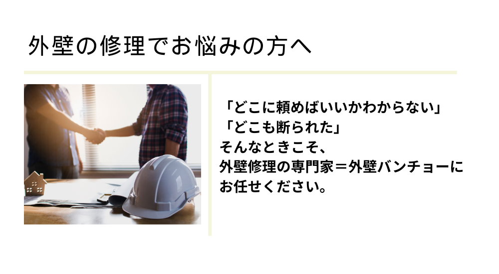 「壁に違和感がある」「塗装じゃどうにもならないかも」──そう感じたら、外壁修理の専門店である外壁バンチョーにご相談ください。