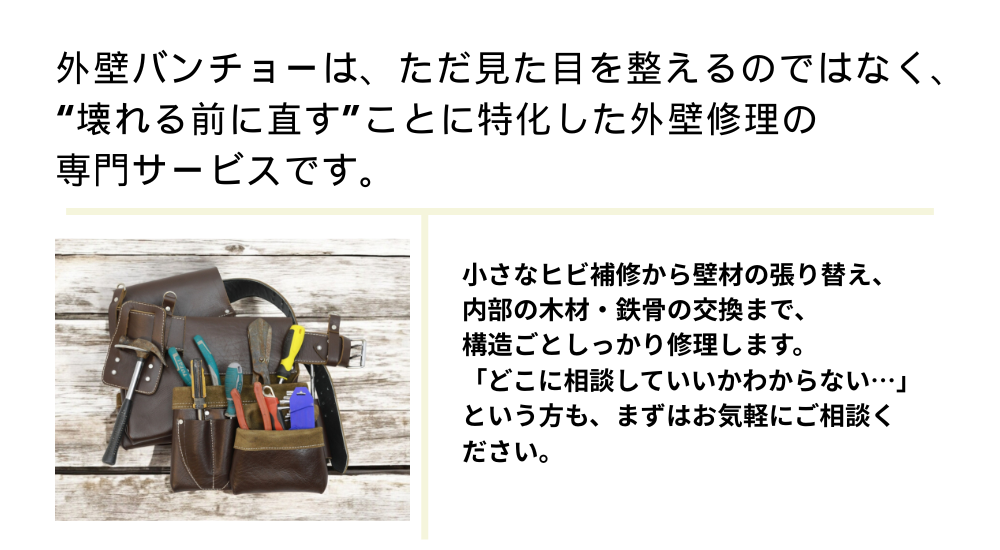 私たち外壁バンチョーは、「修理だけで勝負する珍しいプロ集団」として、塗る前に直す。