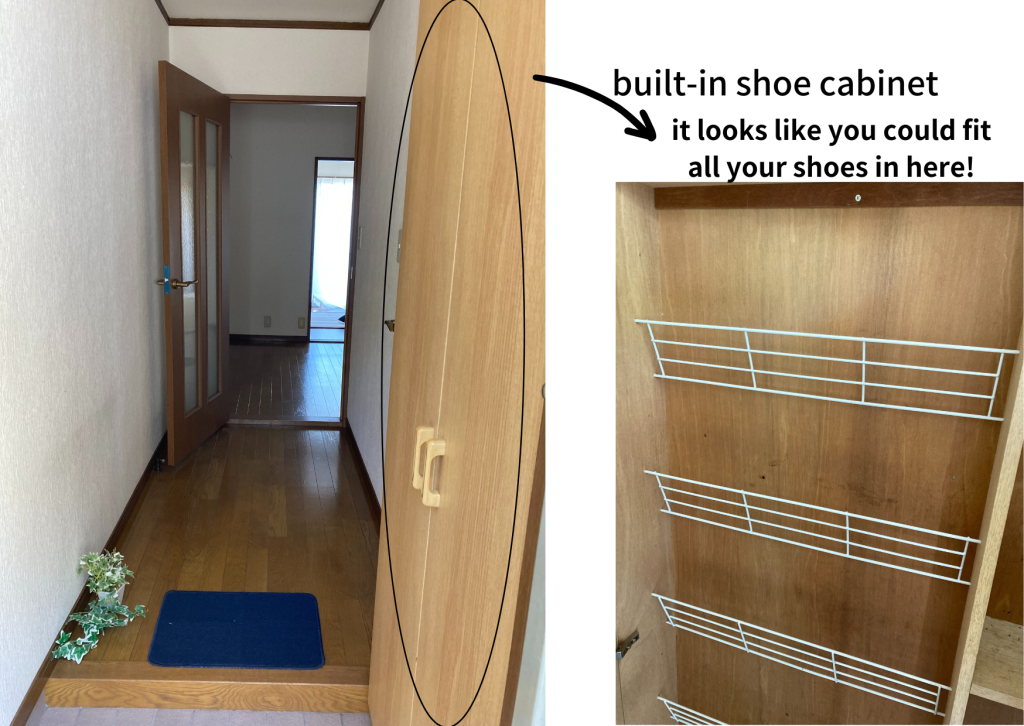 There’s a built-in shoe cabinet with plenty of space — it looks like you could fit all your shoes in here!